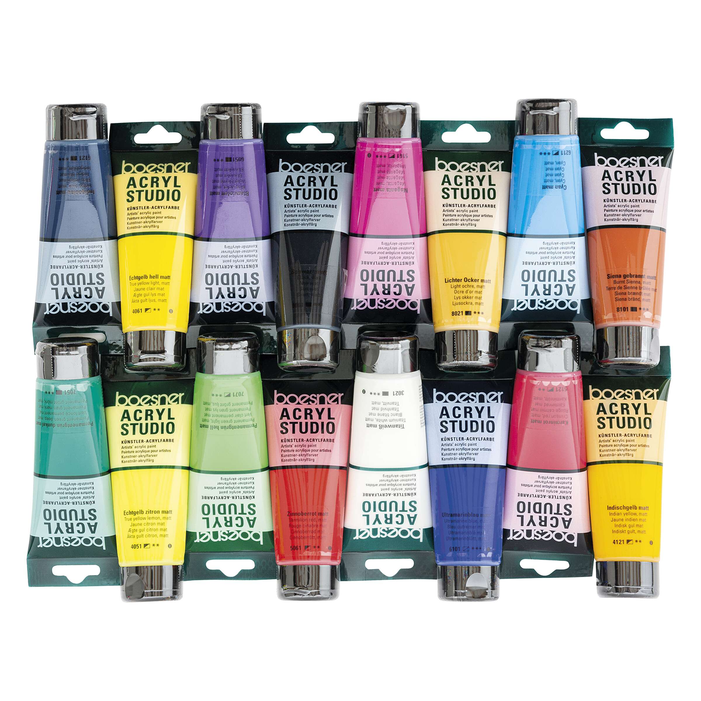 18 matta kulörer kompletterar den beprövade Acryl Studio-serien. Den universala akrylfärgen med medelfin konsistens har mycket goda målartekniska egenskaper. Den uppfyller därför de höga krav som ställs på en konstnärsfärg av studiokvalitet. Den omsorgsfullt utvalda färgpaletten med matta kulörer inkluderar 7 enpigmentskulörer och garanterar en generös mångfald av färg, tack vare att färgerna går så bra att blanda med varandra. Ett speciellt motståndskraftigt bindemedel av hög kvalitet som inte gulnar garanterar mättade och briljanta färger. Utöver de matta färgerna innehåller Studio-serien 48 klassiska kulörer, en luminiscensfärg samt lasyr- och metallic-färger.