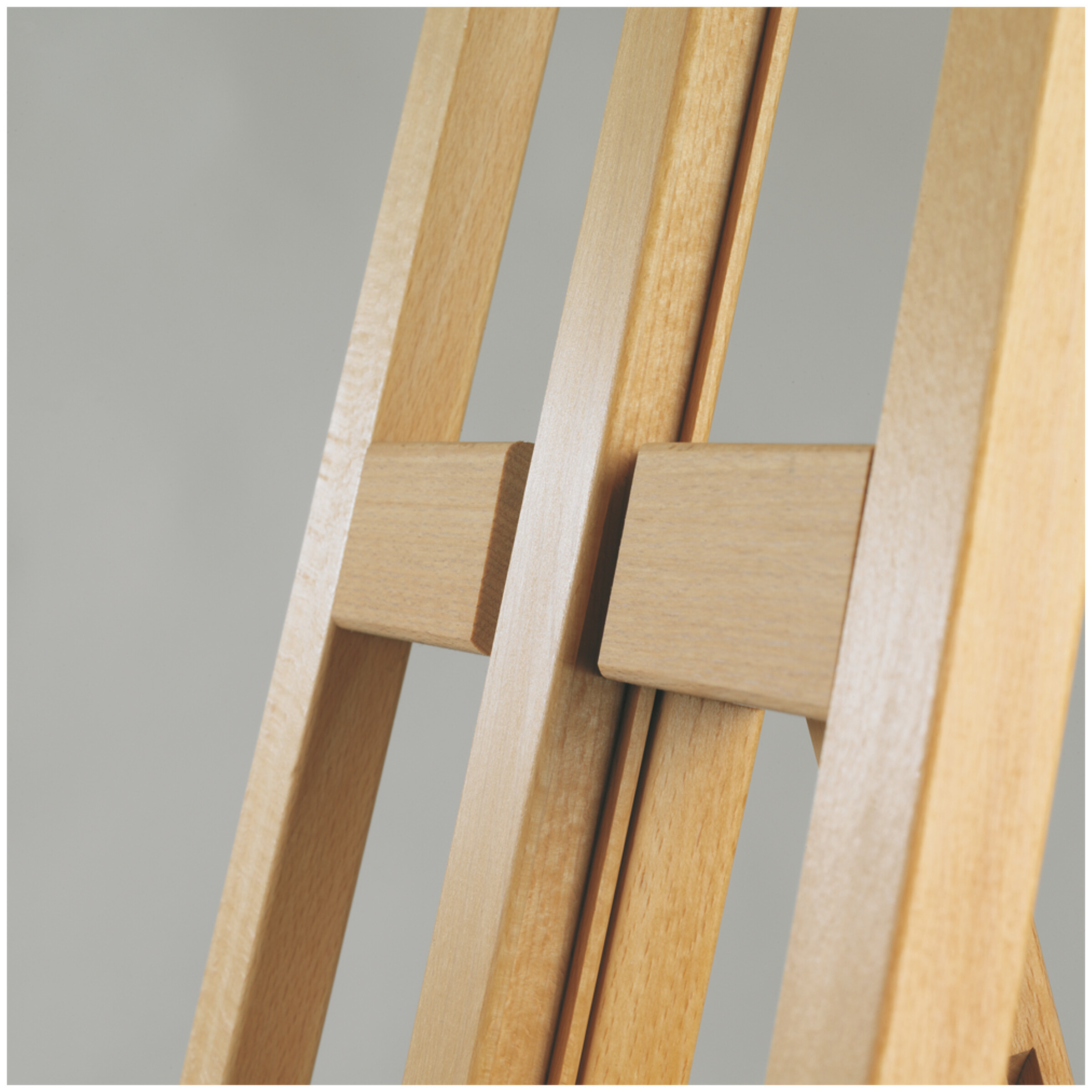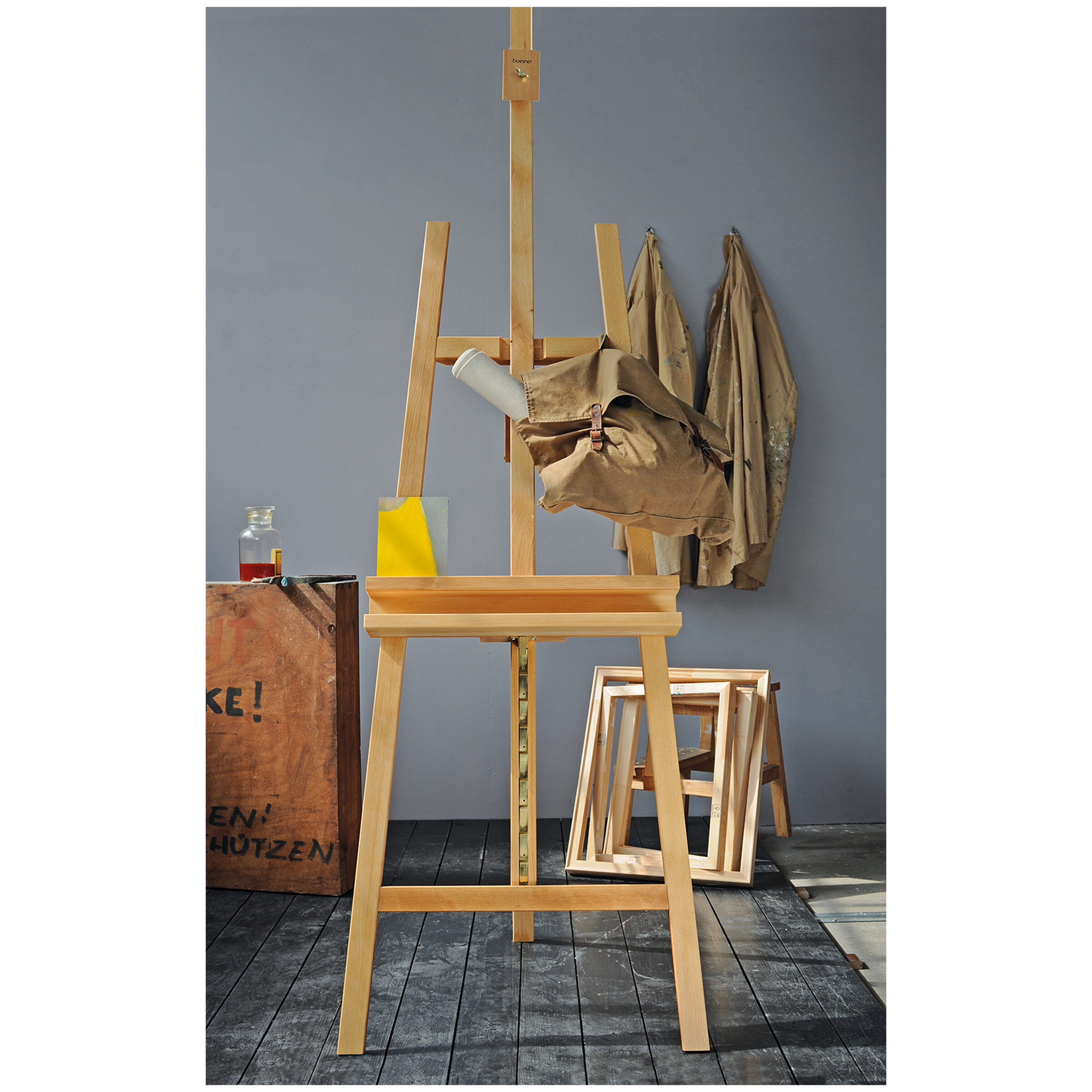 Tillverkat av massiv bok, behandlat med linolja. Vår klassiker bland stafflier! På det mycket solida akademistaffliet som har tillverkats av snickare ligger målarunderlaget plant på alla tre listerna (ytterlistplatta och mellanlist) så att en stabil stödyta alltid garanteras. Staffliet har ett bord med dubbla hyllplan som kan höjas och sänkas med hjälp av en snäppmekanism. Det kan lutas på olika sätt med hjälp av en skruvmekanism och kan även fällas ihop.