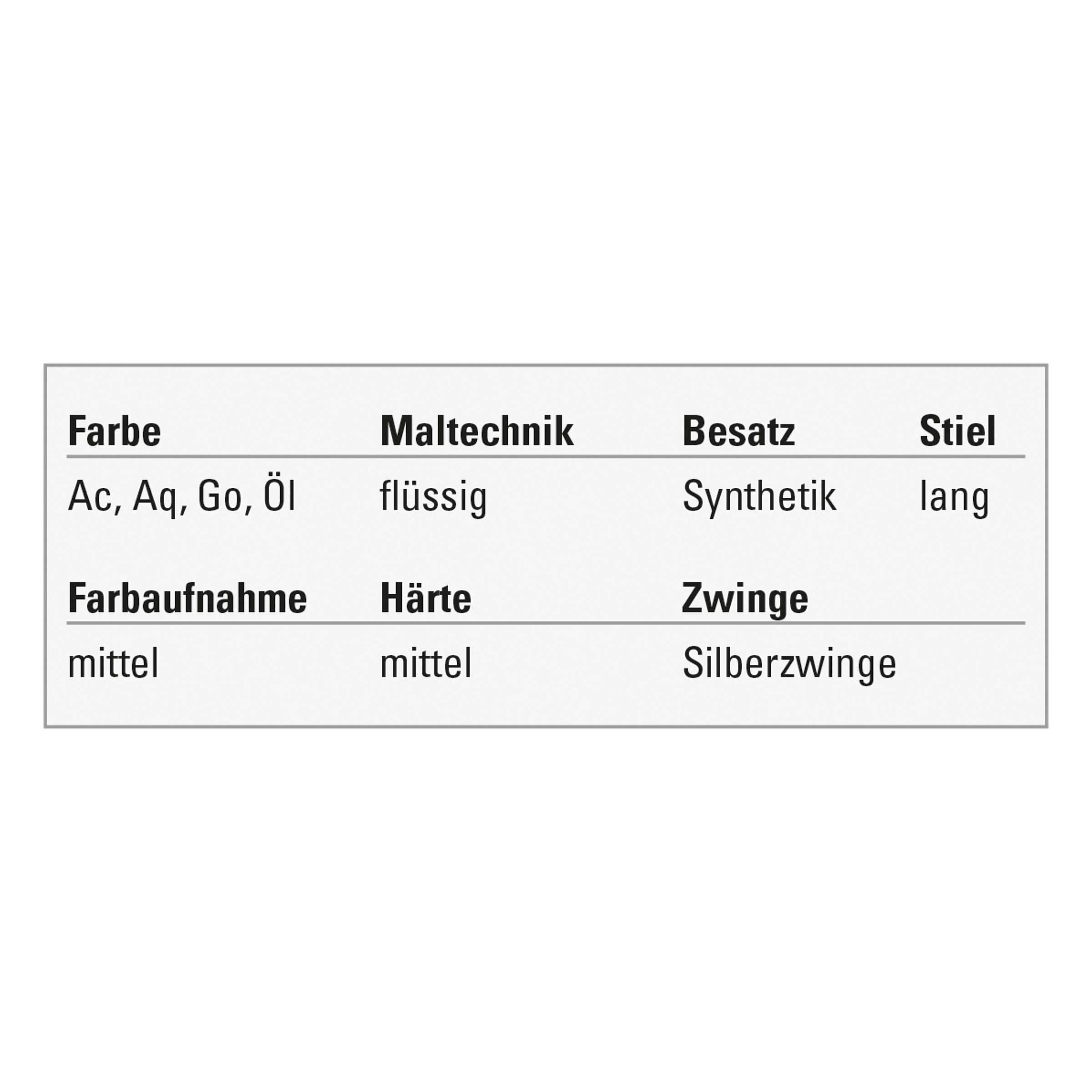 Penselns extra fina guldfärgade syntetiska fibrer kännetecknas av mycket hög elasticitet. Nova-oljemåleripenseln föredras även för akrylmåleri eftersom akrylfärger för det mesta målas mer flytande än oljefärger. Den lämpar sig särskilt bra för arbete på grova målarunderlag. Sömlös silverklämma, långt, grönt polerat skaft. Made in Germany.