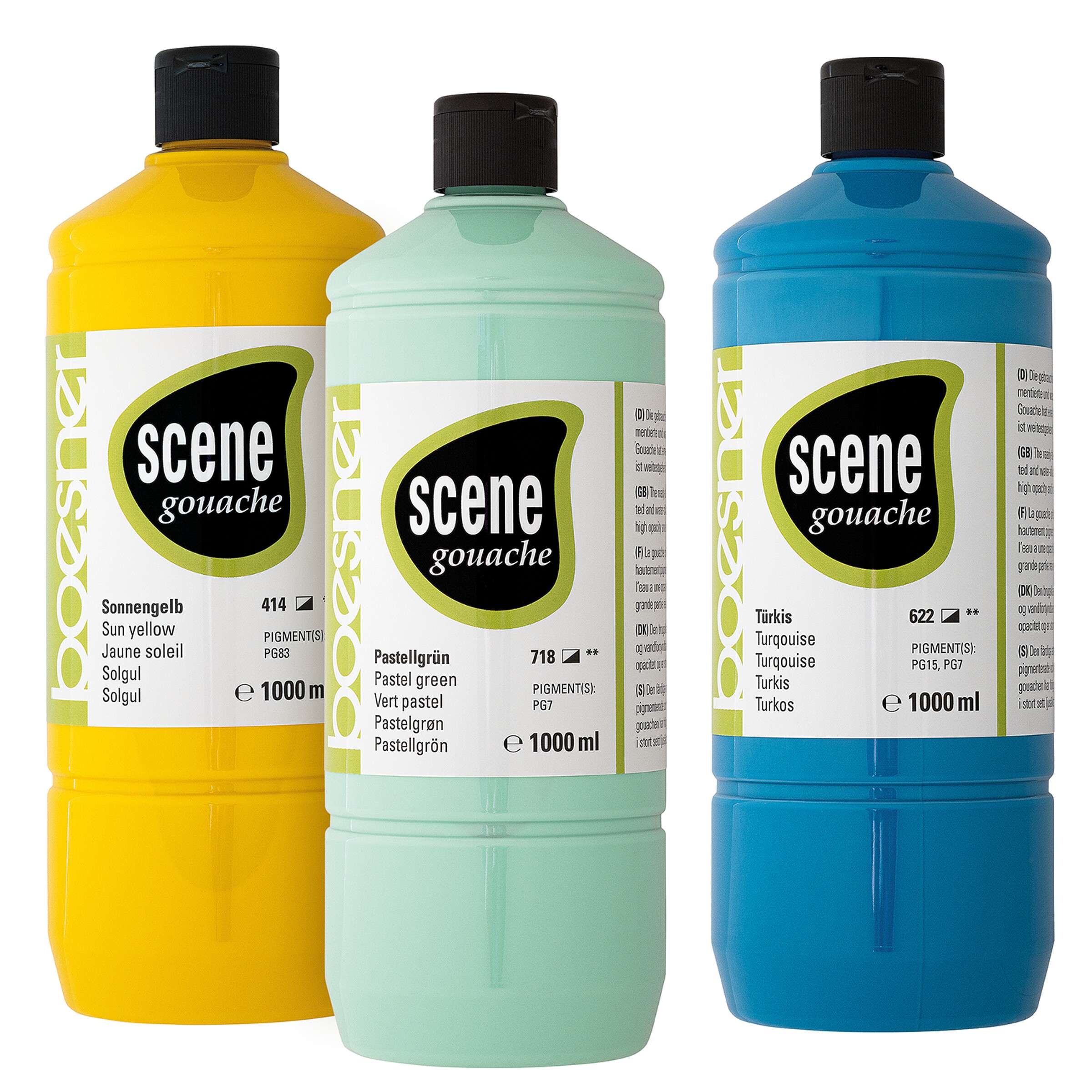 Flytande, högpigmenterad gouache i utmärkt grundkvalitet, med enastående täckförmåga för alla lätt sugande ytor som papper, kartong och trä. Den bruksfärdiga färgen torkar matt, kan spädas ut och även lösas med vatten för vidare användning efter torkning. Som det perfekta mediet för spontana utkast, färgappliceringar på stora ytor eller inom konstutbildning är Scene Gouache särskilt mångsidig och lätt att använda. Färgsortimentet på 27 kulörer – vilket är ovanligt brett för en gouache – inklusive 19 enpigmentskulörer, inkluderar 6 pastellkulörer samt guld och silver. Perfekt för frekventa användare.